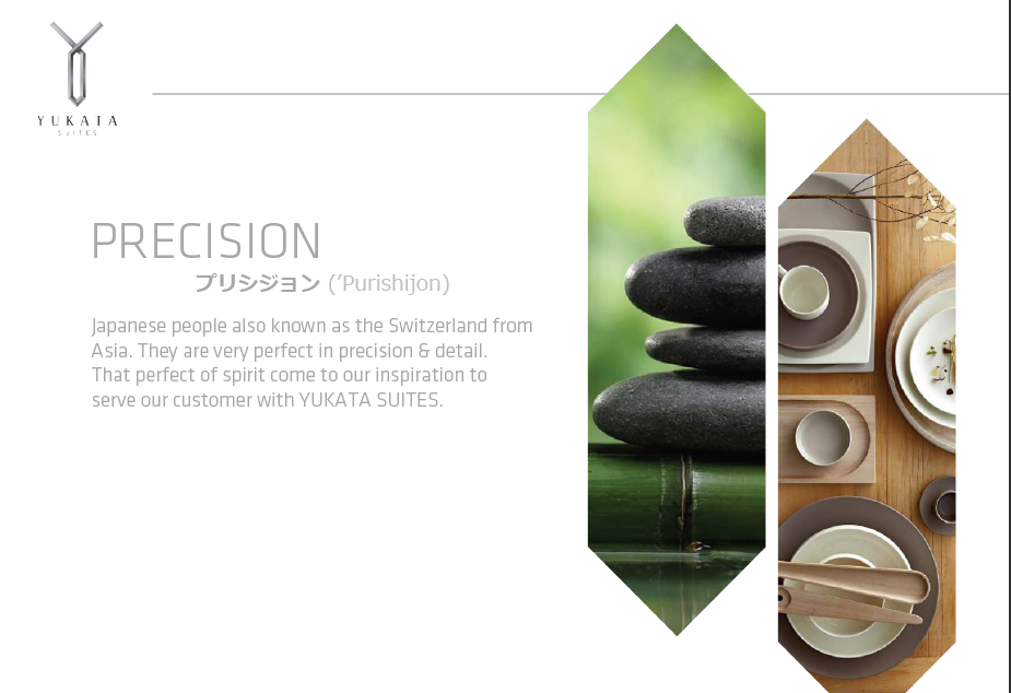 Yukata Suites terinspirasi dari bahasa Jepang ‘y u k a t a’ yg merupakan pakaian tradisional yg dipakai saat musim panas. Masyarakat Jepang biasa mengenakan Yukata sblm ke pemandian air panas utk melepaskan diri dari rutinitas & mencari ketenangan diri.